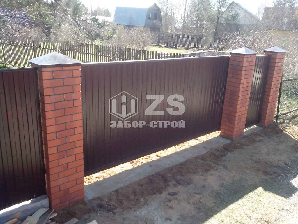 - Забор с кирпичными столбами из профнастила 20 метров