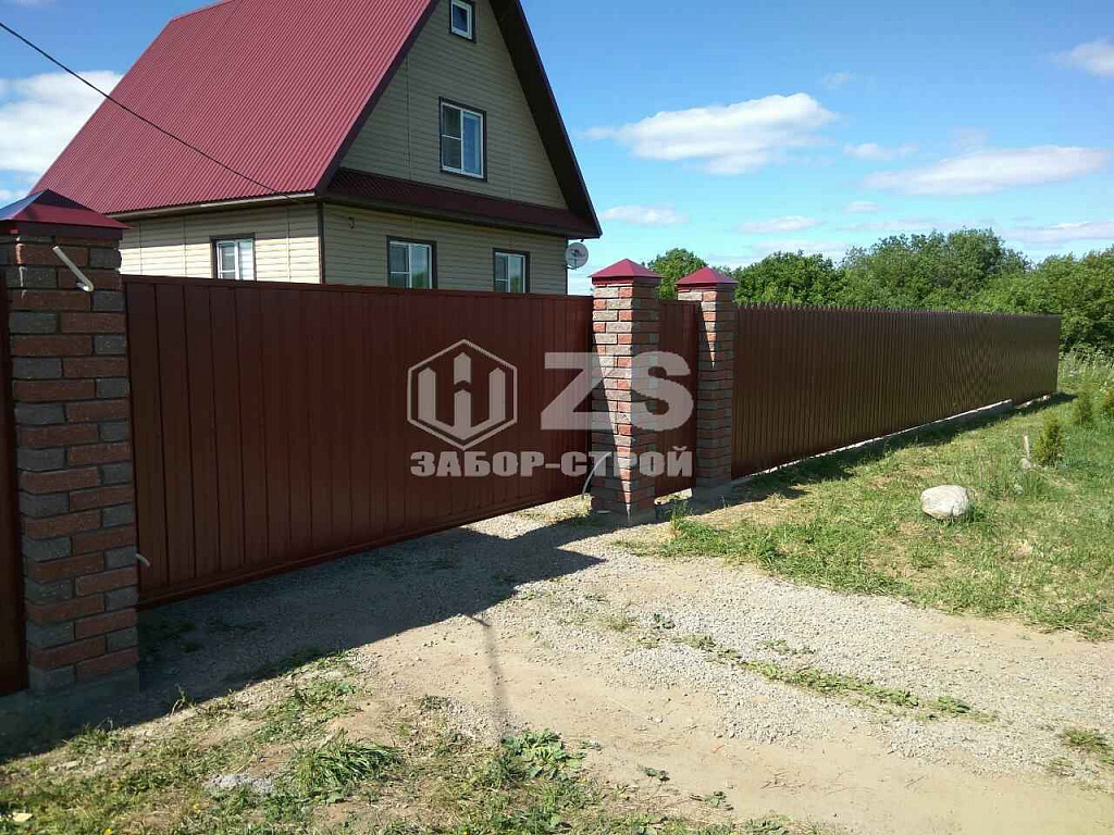 - Забор с кирпичными столбами из профнастила 25 метров